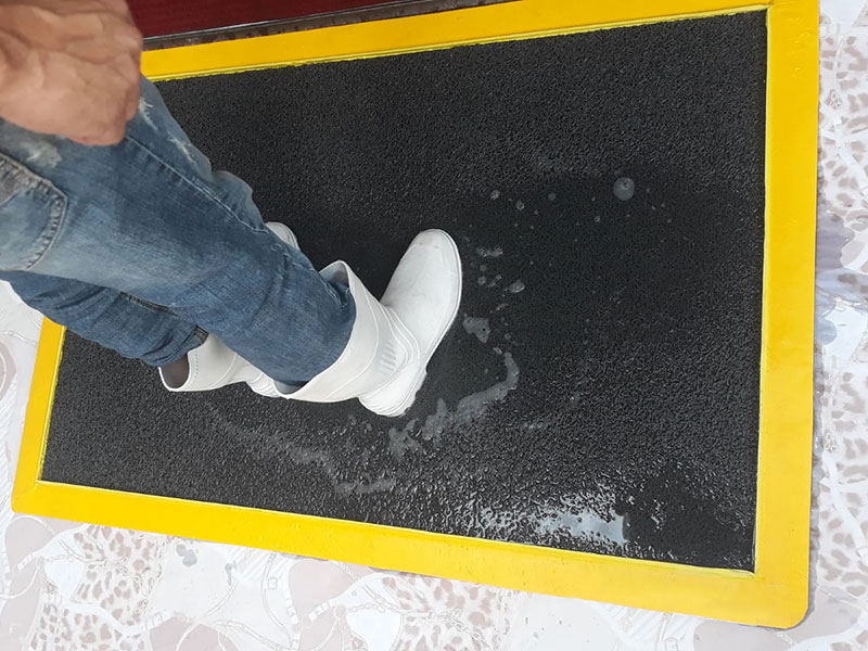 – Quando a pessoa passa pelo tapete, ao pisar sobre ele, a solução sanitizante “lava” o solado do calçado, eliminando assim, os contaminantes ali contidos;